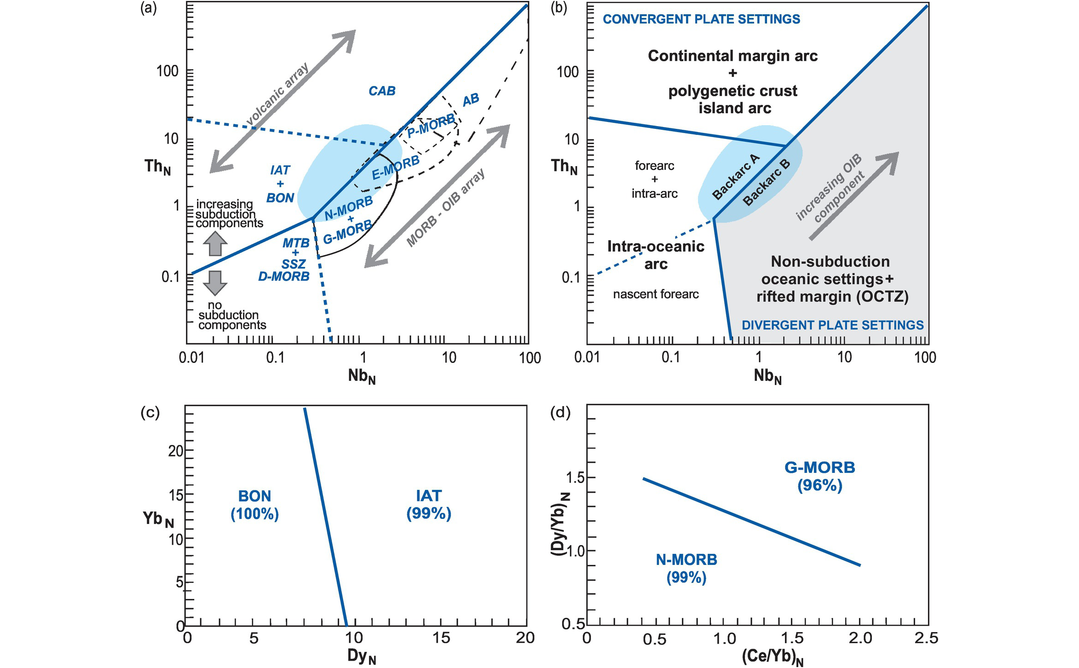 Pearce (2008) demonstrated the utility of the Th-Nb proxy for identifying a crustal component in basalts, most probably introduced via subduction fluids, and thereby discriminating between subduction-related and non-subduction oceanic settings. In this case Saccani (2015) avoided the problem of spurious self-correlation by normalizing Nb and Th to the N-MORB values of Sun and McDonough (1989). Using a test dataset of 565 analyses, he was able to verify a high level of distinction (>94%) between the MORB–OIB and the volcanic arc arrays (Figure 5.1a) and interpreted these within a plate tectonic framework (Figure 5.1b). To better distinguish basalts within the MORB–OIB array, Saccani (2015) was also able to successfully (>99%) discriminate between island arc tholeiites and boninites using a DyN–YbN diagram (Figure 5.1c) and between normal (N-) MORB (99%) and garnet influenced (G-) MORB (96%) on the binary diagram CeN/YbN versus DyN/YbN (Figure 5.1d). In the latter two diagrams samples are normalized to the chondrite values of Sun and McDonough (1989).