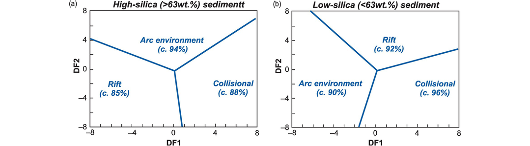 The DF binary diagram of Verma and Armstrong-Altrin (2013) (Figure 5.10) discriminates between arc, rift and collisional settings in sand-sized clastic sediment (Table 5.1). The diagram is based on ten major element oxides (SiO2, Al2O3, CaO, Na2O, K2O, P2O5, TiO2, MnO, MgO, FeOT) and its effectiveness is optimised when clastic sediments are divided into high-silica (SiO2 = 63–95 wt.%) and low-silica (SiO2 = 35–63 wt.%) groups. The field boundaries were determined using a trial dataset of >2200 analyses; the DFs are given in Appendix 5.1. Both diagrams successfully differentiate between arc settings in which there is active volcanism, extensional rift settings and sediments formed in a collisional, compressional setting (<25% misclassification). These authors also demonstrate that the chemical changes caused by weathering, recycling and diagenesis are unlikely to significantly affect the results of major element DF analysis.