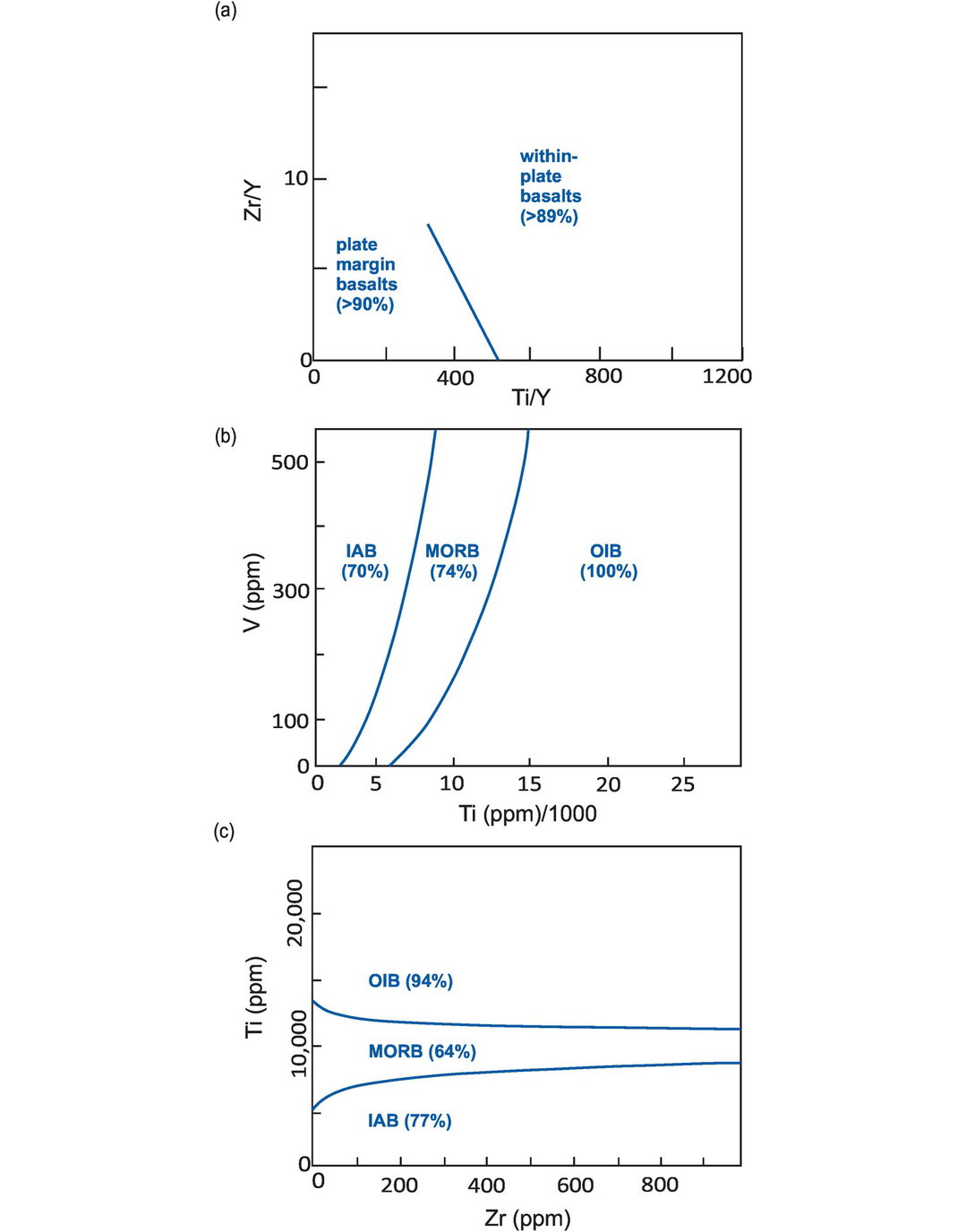 Binary classification diagrams for mafic volcanic rocks. Numbers in parentheses represent the percentage of the empirical test data set successfully classified. (a) Ti/Y versus Zr/Y (Pearce and Gale, 1977). This diagram only provides a robust statistical distinction between within-plate (rift and ocean island) and plate margin (island arc and back-arc) basalts and excludes enriched mid-ocean ridge (E-MORB) compositions (Verma, 2010). Boundary coordinates: (513, 0) and (313, 7.5). (b) Ti/1000 versus V (Shervais, 1982) with the redefined boundaries of Vermeesch (2006a; with permission from John Wiley & Sons). This diagram provides a robust statistical recognition of island arc, mid-ocean ridge and ocean island basalts. The curved boundaries of this diagram should be accurately traced or scanned. (c) Zr versus Ti (Pearce and Cann, 1973) with the redefined boundaries of Vermeesch (2006a; with permission from John Wiley & Sons). This diagram provides the robust statistical recognition of island arc and ocean island basalts, but is less reliable for MORB. The curved boundaries should be accurately traced or scanned. IAB, island arc basalt; MORB, mid-ocean ridge basalt; OIB, ocean island basalt.