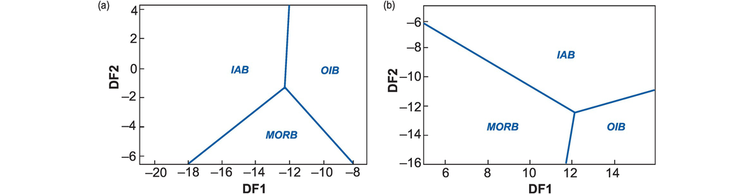 Discriminant function binary diagrams for oceanic basalts. (a) Major element oxides (without FeO) (after Pearce, 1976, and reassessed by Vermeesch, 2006a). The overall misclassification of trial data is only 7%. Boundary coordinates: central point (−12.23, −1.37), IAB–OIB (−12, 4), OIB–MORB (−8, −6.45), MORB–IAB (−18, −6.6). (b) TiO2–Zr–Y–Sr (after Butler and Woronow, 1986, and reassessed by Vermeesch, 2006a). The overall misclassification of trial data is only 8%. Boundary coordinates: central point (12.17, −12.23), IAB–OIB (15.9, −10.93), OIB–MORB (11.85, −16), MORB–IAB (5.02, −6.28). IAB, island arc basalt; MORB, mid-ocean ridge basalt; OIB, ocean island basalt. See Appendix 5.1 for discriminant function equations.