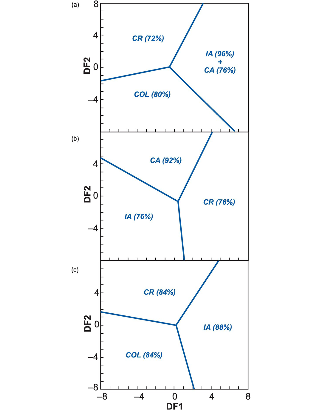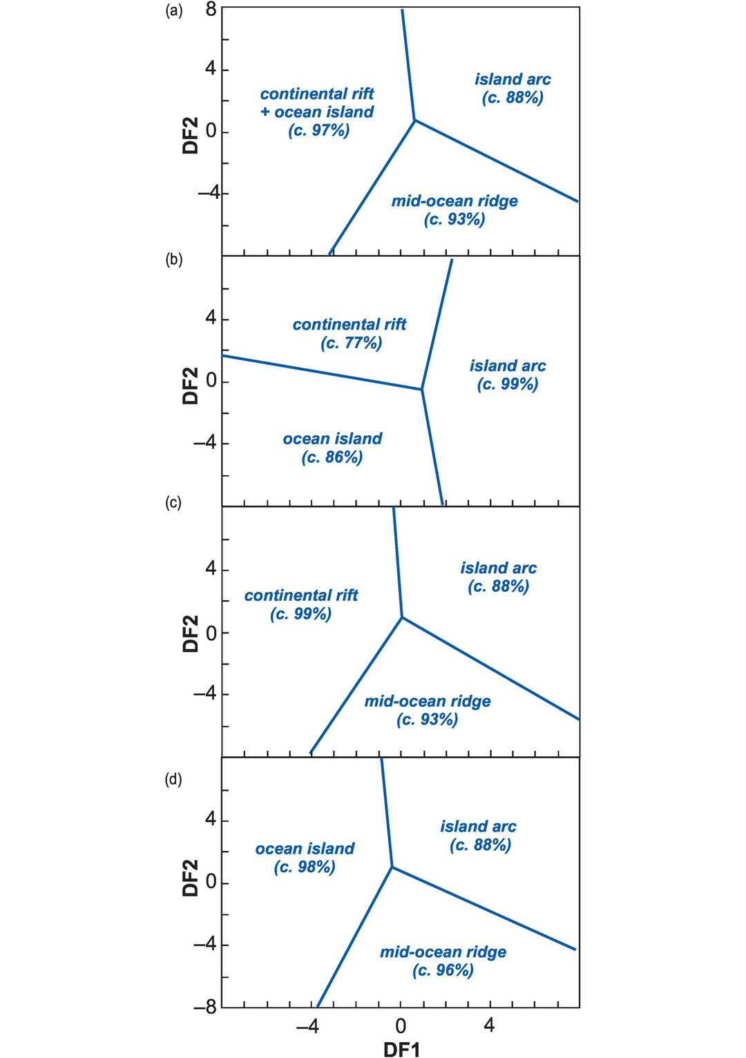These discrimination diagrams (Figure 5.7) are intended to be used sequentially. In each case the first panel (a) successfully segregates within plate (CR + OI) and collisional (COL) settings from arc (IA + CA) settings. The remaining panels (b–d) are used to better differentiate between the different arc settings and minimize misclassification. In Figure 5.7 we present only four of the five original diagrams by Verma and Verma (2013) (shown shaded in Table 5.2) because these have the highest probability of successful classification. See Appendix 5.1 for the DF axes equations.