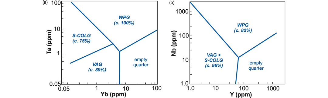 The first systematic study in which granite geochemistry was related to tectonic setting was by Pearce et al. (1984). In this study the term ‘granite’ was defined very loosely as ‘any plutonic rock containing more than 5 per cent of modal quartz’. Using suite of 600 selected granites, the authors determined that the elements Y, Yb, Rb, Ba, K, Nb, Ta, Ce, Sm, Zr and Hf most effectively discriminated between ocean ridge (ORG), volcanic-arc (VAG), within-plate (WPG) and syn-collisional (S-COLG) granite types. Verma et al. (2012) reassessed these data using modern statistical methods and concluded that ORGs cannot be classified using this approach (although the number of ORG samples in the original data set was very low, n = 5).