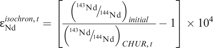where the composition of CHUR at time t is calculated from Eq. 6.15 or Eq. 6.17. When calculating εNdt for individual samples the value for t may be taken either from the isochron to which the samples belong or from an independent estimate of the age using some other geochronological technique such as a U–Pb zircon age.
