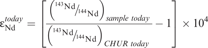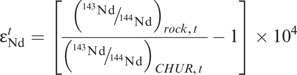where (143Nd/144Nd)initial is the measured initial ratio of the sample suite at the time of its formation (t) and is calculated from the isochron. (143Nd/144Nd)CHUR,t is the isotope ratio of CHUR at time (t) given by the expression:
