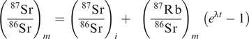 where t is the age and λ is the decay constant. Time is measured from the present and is expressed as either Ma (106 years) or Ga (109 years). The intercept on the (87Sr/86Sr) axis is equal to the initial ratio (87Sr/86Sr)i, a parameter of considerable petrogenetic importance and discussed more fully later in this chapter.