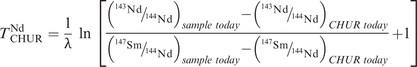 where λ is the decay constant, t is an arbitrarily selected time in the past to construct the evolution curve, and 147Sm/144Nd is the present-day ratio in the sample. Alternatively, a CHUR model age is calculated from the present-day 147Sm/144Nd and 143Nd/144Nd of a single sample using the equation