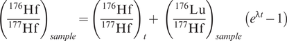 where λ is the decay constant of 176Lu to 177Hf and t is time in the past for the part of the evolution curve of interest. Values for CHUR are given in Table 6.3.