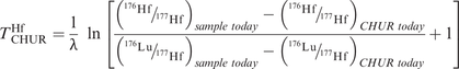 where (176Hf/177Hf)initial is the measured initial ratio of the sample suite at the time of its formation (t) and is calculated from the isochron. (176Hf/177Hf)CHUR,t is the isotope ratio of CHUR at time (t) and is given by the expression: