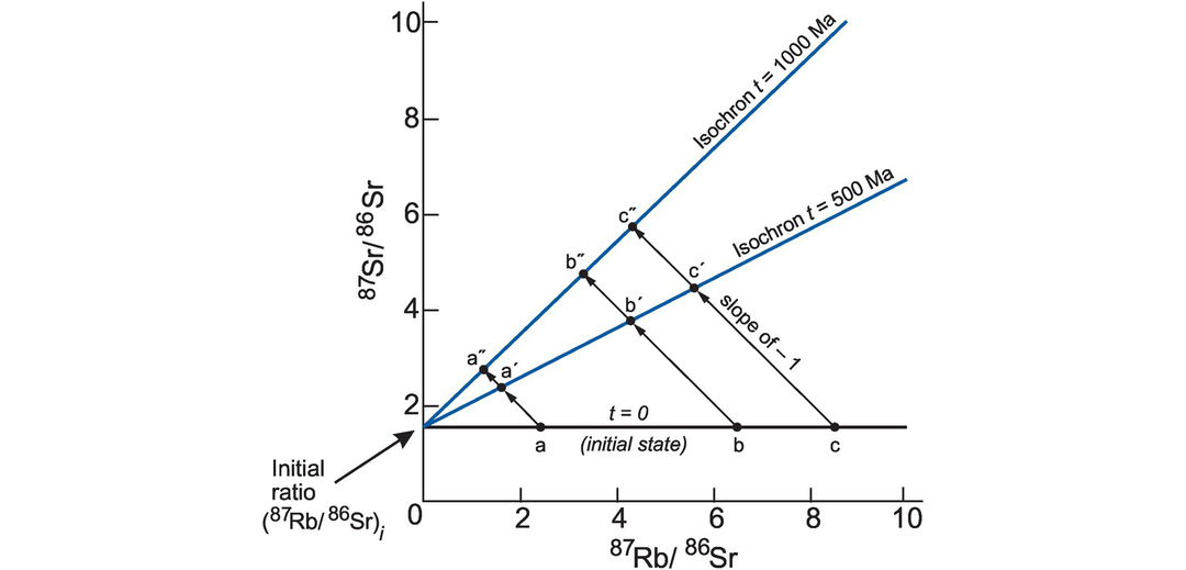 Schematic isochron diagram. A suite of igneous rocks (a–c) form at t = 0 from the same batch of magma which subsequently differentiated. They evolve over 500 Ma and 1000 Ma. At t = 0 each member of the rock suite has the same initial ratio (87Sr/86Sr)i but because the magma suite is chemically differentiated, each rock has a different concentration of Rb and Sr, and therefore a different 87Rb/86Sr ratio. Each sample plots as a separate point on the 87Rb/86Sr versus 87Sr/86Sr isochron diagram. From t = 0 to t = 500 Ma or t = 1000 Ma, individual samples evolve along a straight line with a slope of −1 (e.g., a–a′–a′′) reflecting the decay of a single atom of 87Rb to a single atom of 87Sr. In practise the resulting change in 87Sr/86Sr is small and the vertical scale is normally exaggerated so the path taken by these points will be closer to a vertical line. The amount of 87Sr produced in a given sample is proportional to the amount of 87Rb present. The slope of each isochron (t = 500 Ma, t = 1000 Ma) is proportional to the age of the sample suite. The intercept on 87Sr/86Sr is the initial ratio.