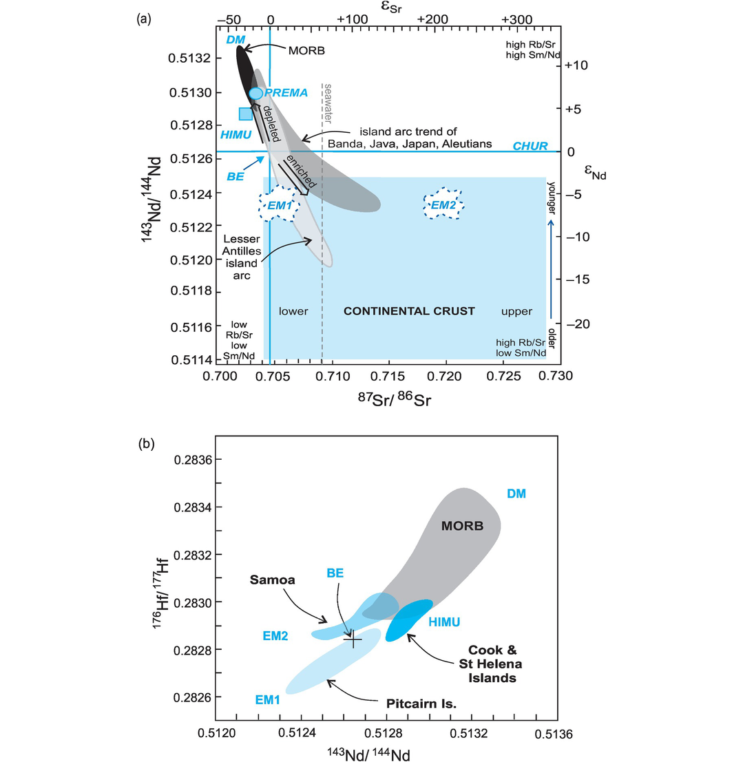 We showed in Section 6.3.2 that the Earth’s mantle can be characterised using the isotopes of Nd, Hf, Sr, Pb and Os into four distinct reservoirs: the depleted mantle (DM), mantle with a high 238U/204Pb ratio (HIMU) and enriched mantle reservoirs (EM1 and EM2). Each of these mantle reservoirs records its own ‘story’ of the processes which have led to its current composition, although it is important to note that to date these ‘stories’ are only partially told. The DM is thought to record events which relate to crust extraction, whereas the HIMU mantle records events of U gain or Pb loss through the in-mixing of altered oceanic crust or the loss of lead to the core or through fluid processes. There are also several models for the origin of the enriched mantle (EM) which include the recycling of crustal materials, enrichment by the migration of mantle melts and the mixing of sub-continental lithosphere into the mantle.