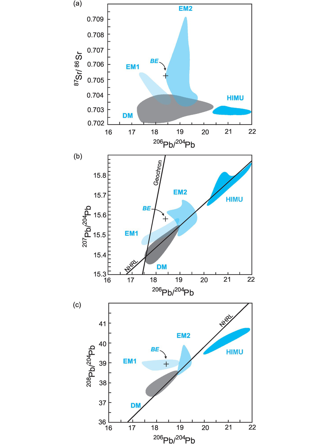 Epsilon values may be calculated from 87Sr/86Sr ratios in exactly the same way as for Nd isotopes. Original estimates for the 87Sr/86Sr composition of the bulk Earth as a reference value vary significantly, but Salters and Stracke (2004) define a well-constrained BE composition of 0.7045 (Table 6.3). Using a realistic trace element ratio (Rb/Sr = 0.29–0.30) and assuming an initial 87Sr/86Sr of 0.69898, their BE composition yields 87Sr/86Sr values which are in agreement with values for modern MORB.