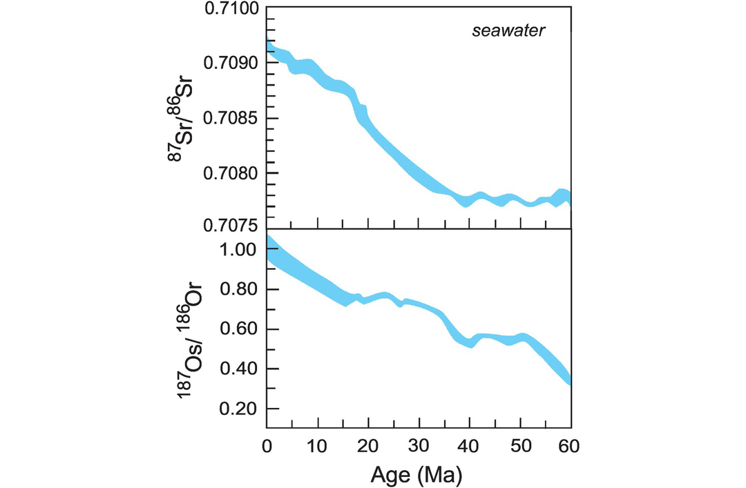The isotopic variation in the composition of seawater over the last 60 Ma. The data for 87Sr/86Sr are from Veizer et al. (1999) and for 187Os/188Os from Peucker-Ehrenbrink and Ravizza (2000). The variation is thought to be associated with an increase in continental weathering during this time interval.