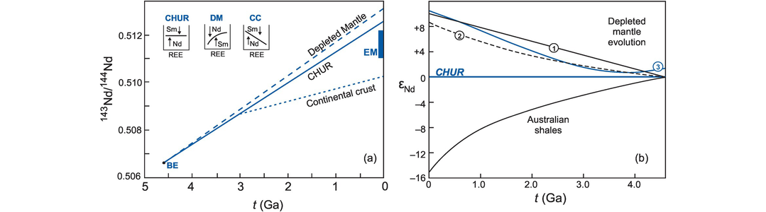 Evolution of Nd isotopes with time. (a) The evolution of 143Nd/144Nd for CHUR (solid line), DM (dashed line), and the continental crust (CC, dotted line) from the initial composition of the bulk Earth (BE). The fractionation of Sm/Nd from BE is normalised to unity for CHUR; DM has high Sm/Nd resulting in higher 143Nd/144Nd; and CC has lower Sm/Nd which retards 143Nd/144Nd evolution with time. The enriched mantle (EM) component (blue box) shows some affinity with the continental crust inasmuch as it also has retarded 143Nd/144Nd. Note that in the Sm–Nd system, the crust shows retarded isotopic evolution, whereas in the Rb–Sr system it shows accelerated evolution relative to BE and the mantle. (b) The contrasting evolution of the continental crust and mantle using εNd notation (Section 6.3.4). CHUR = 0 and plots as a horizontal line. Three curves are shown for the evolution of the depleted mantle. Line 1 assumes a single-stage, linear evolution for the depleted mantle between 4.5 Ga (εNd = 0) and the present day (εNd = +10) (Goldstein et al., 1984). Curve 2 assumes an exponential evolution that is derived from the equation 0.25t2 – 3t + 8.5, where t is the time before present in Ga (DePaolo, 1981a). Curve 3 is a multi-stage model that shows an inflection at ~3 Ga thought to reflect the initiation of the growth of the continental crust (Nägler and Kramers, 1998). The curve in the bottom half of the diagram is for Australian shales and approximates to the evolution of average continental crust through time (Allegre and Rousseau, 1984). Note the time axes in (a) and (b) are reversed.