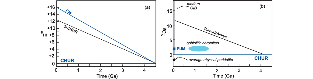 Mantle evolution with time for Hf and Os isotopes. (a) Hafnium isotopes (using εHf notation) showing two linear models for mantle evolution for εHf in the depleted mantle (DM) (after Söderlund et al., 2004) and for S-CHUR (after Caro and Bourdon, 2010). (b) Osmium isotopes (using γ notation) showing Os enrichment of the mantle as a function of time. Note the wide range of modern OIB compositions and the near-chondritic nature of some ophiolitic chromites; the primitive upper mantle (PUM), CHUR and average abyssal peridotite are shown for reference.