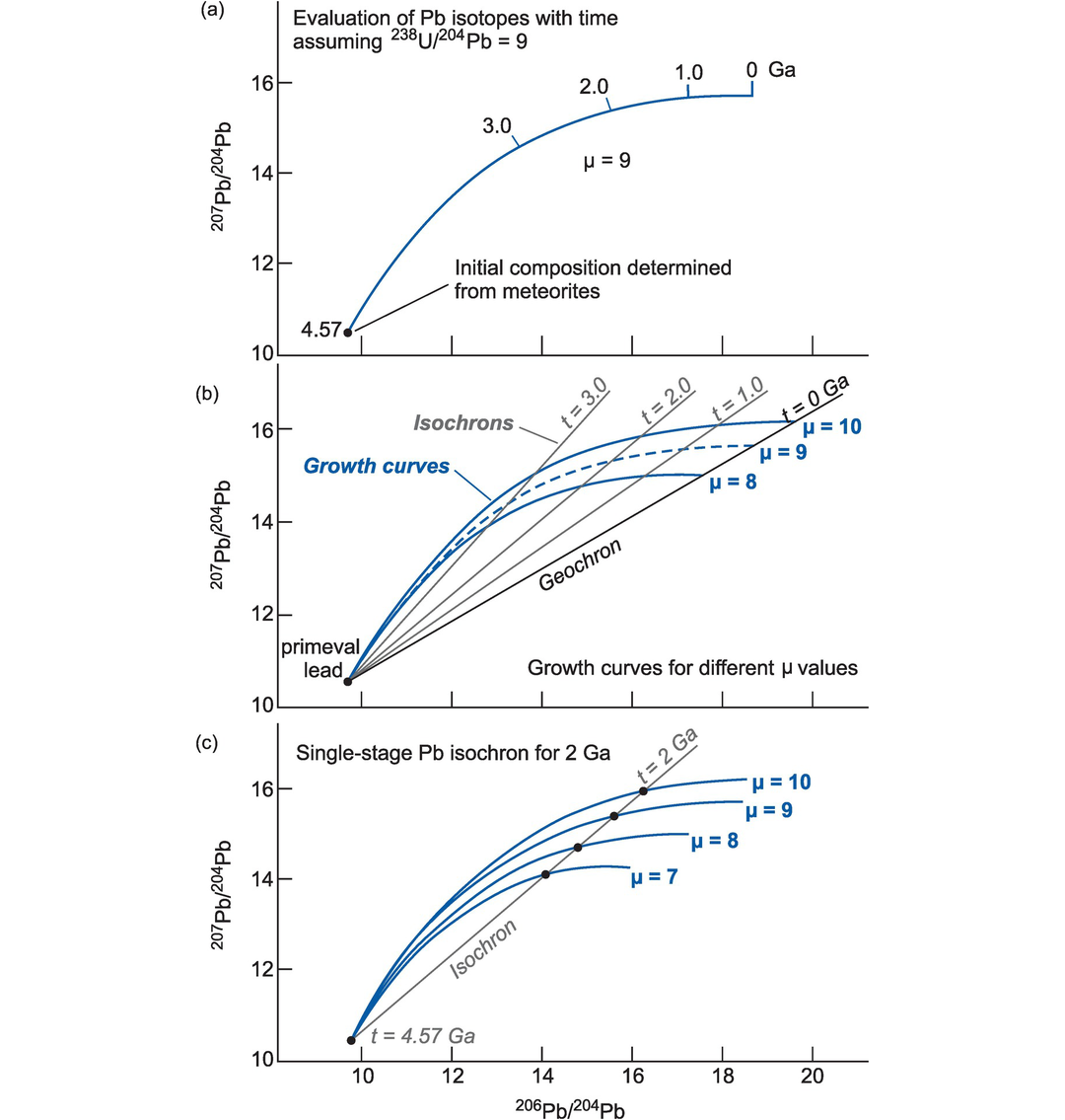 The isotopic evolution of lead isotopes over geological time is illustrated in Figures 6.16 and 6.17. Given that there are three independent decay schemes in the lead isotopic system, Pb data is not displayed on the same type of time versus isotope ratio diagram as is used for Sr, Nd, Hf and Os isotopes; rather, a concordia diagram is used. On this diagram ‘families’ of concordia (growth) curves can be drawn for different 238U/204Pb (μ values) (Figure 6.16a, b). Each curve can be calibrated for time, and equal time points can be used to generate isochrons (Figure 6.16b, c). Bolhar et al. (2020) used this approach to calculate a Pb isochron age of 2054 ± 99 Ma for phoscorites and carbonatites from the Phalaborwa Complex, South Africa. These authors then used the isochron age to evaluate the relative crust and mantle contributions to the sulphide genesis.