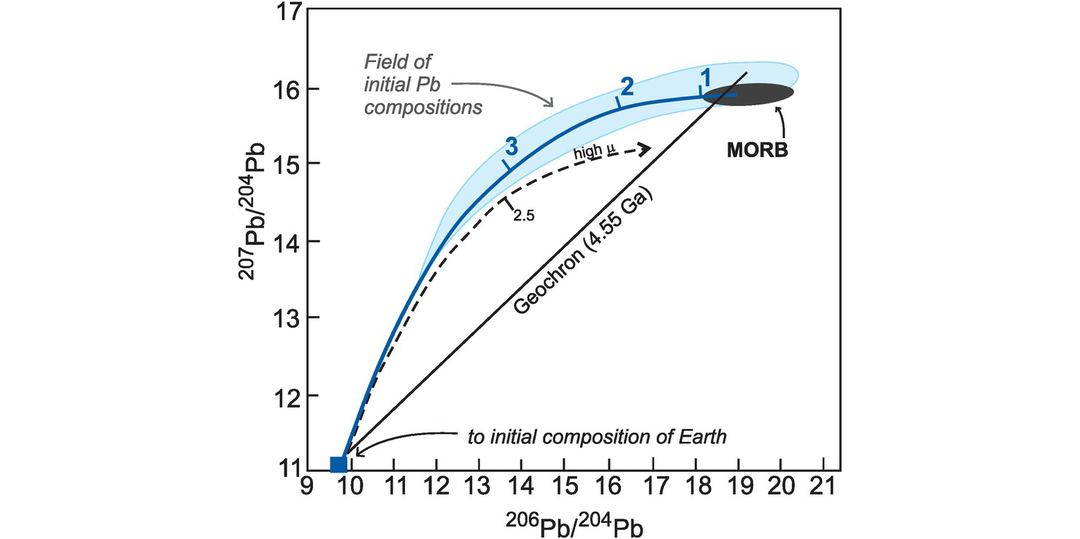 The evolution of lead isotopes with time. A 206Pb/204Pb versus 207Pb/204Pb plot showing the evolution of the depleted mantle (blue curve; after Kramers and Tolstikhin, 1997) and a HIMU mantle source (dashed curve; after Kamber, 2015). Note that the HIMU source has lower 207Pb/204Pb than DM for young samples. The MORB field and the field of initial Pb composition for crustal and mantle rocks are indicated. The numbers on the isotope evolution curves represent the time before the present in Ga.