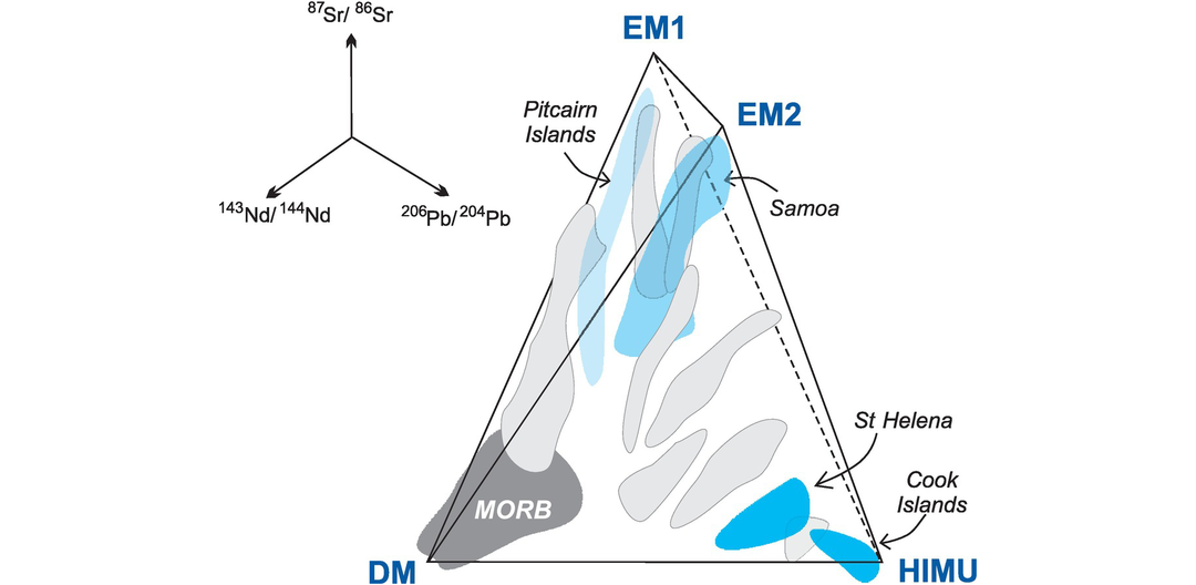 Three-dimensional projection of Sr, Nd and Pb isotopes for oceanic basalts. The interrelationship of the four principal mantle reservoirs is shown in this three-dimensional projection of Sr, Nd and Pb isotopes for oceanic basalts (data from Hart et al., 1992). Coherent trends between reservoirs indicate relative contributions of specific sources to particular OIB systems. For example, the compositional field of the Pitcairn Islands samples extends towards the EM1 component, whereas samples from Samoa trend towards EM2.