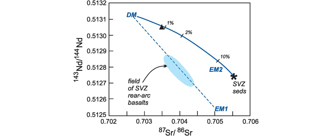 Sr–Nd isotope mixing diagram. 87Sr/86Sr versus 143Nd/144Nd (data from Turner et al., 2017) showing the theoretical (hyperbolic) mixing trend between DM and sediment of the Southern Volcanic Zone (SVZ), Chile (asterisk). The percentages indicate the amount of sediment mixed. EM2 and altered oceanic crust (triangle) are shown for reference. SVZ rear-arc basalts do not lie on this mixing trend but instead lie on a line between DM and EM1. Turner et al. (2017) use these relationships to argue that mixing between DM and SVZ sediment (or EM2) cannot explain the data trend, and therefore an EM1-like component is needed. Combining this with trace element data, the authors suggest that this component represents a metasomatised continental lithospheric mantle.