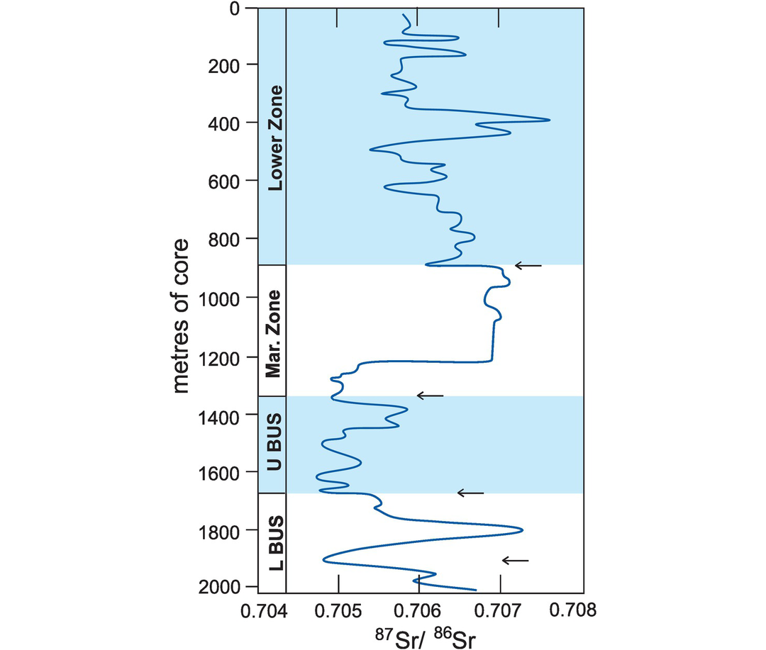 Mixing in a magma chamber. Variable 87Sr/86Sri(2055 Ma) within the lower series of the Bushveld intrusion, South Africa (data from Wilson et al., 2017). Compare the small-scale variations within the upper basal ultramafic sequence (U BUS) or the higher part of the marginal (Mar.) zone, with the large-scale variations between them. Arrows denote sharp decreases in 87Sr/86Sri ratios interpreted to reflect influx of more primitive melt.