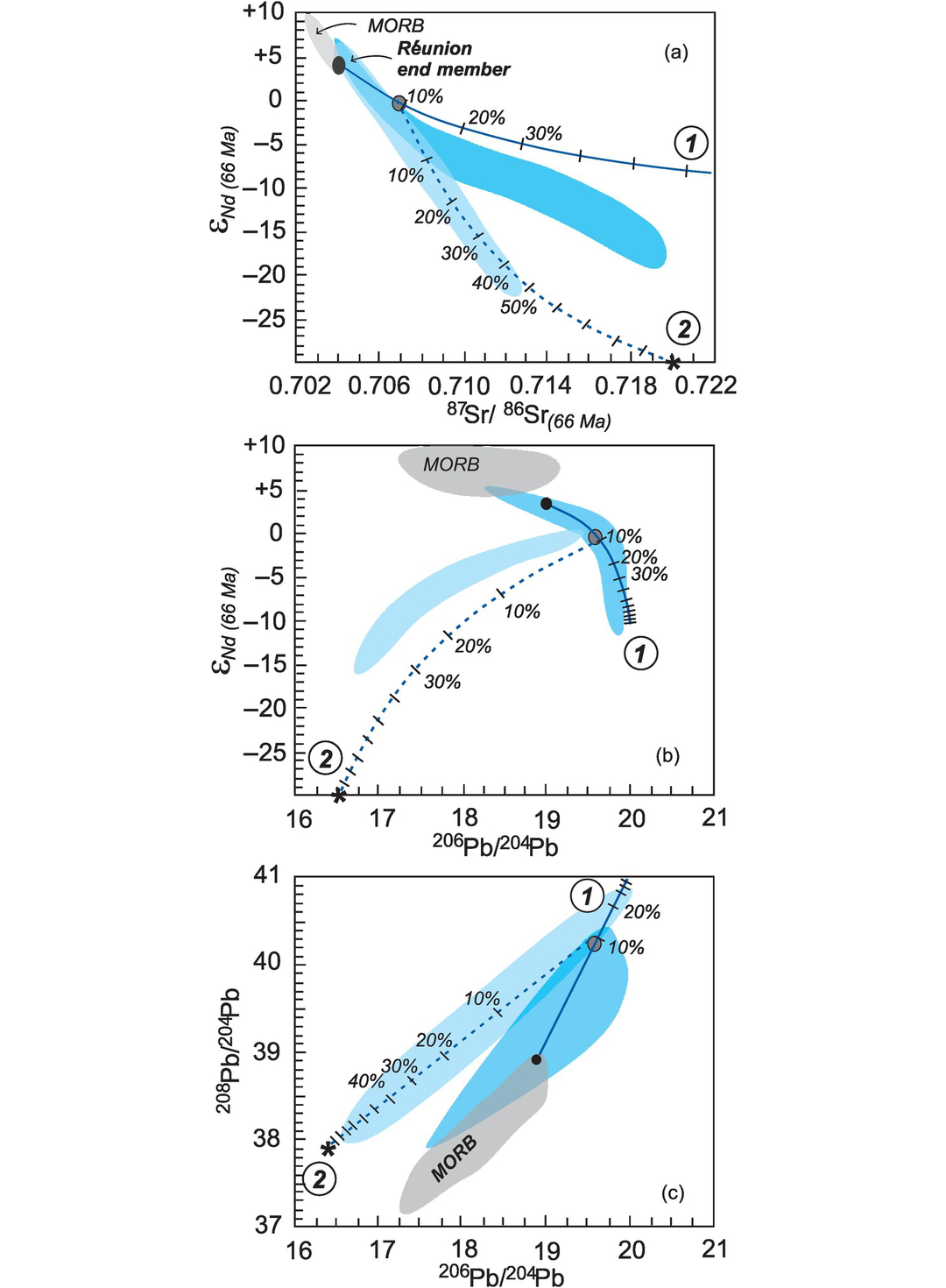 Crustal contamination of Deccan basalts. (a) 87Sr/86Sri (66 Ma) versus εNd; (b) 206Pb/204Pb versus εNd; and (c) 206Pb/204Pb versus 208Pb/204Pb. Deccan flood basalts have Sr, Nd and Pb isotopic compositions that define two compositional trends, implying a three-component mixing scenario (after Haase et al., 2019). The end-member compositions include a parental Réunion basalt (black dot), crustal component 1 (high 206Pb/204Pb, high 87Sr/86Sri and low εNd), and crustal component 2 indicated by the asterisk (low 206Pb/204Pb, moderate 87Sr/86Sri and highly negative εNd). Stage 1 involves the Réunion parent melt assimilating ~10% of crustal contaminant 1 and producing a hybrid melt (grey dot); this leads to stage 2, when the hybrid melt assimilates up to 50% of a plagioclase-rich crustal component.