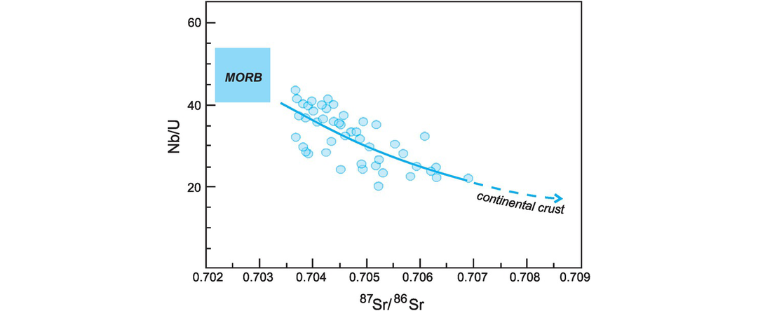 87Sr/86Sr versus Nb/U for basalts from the Society Islands (data from White and Duncan, 1996; modified after Hofmann, 2014; with permission from Elsevier). The curved trend in the basaltic data shown here is consistent with mixing between a depleted mantle component represented by MORB and a continental crustal component.