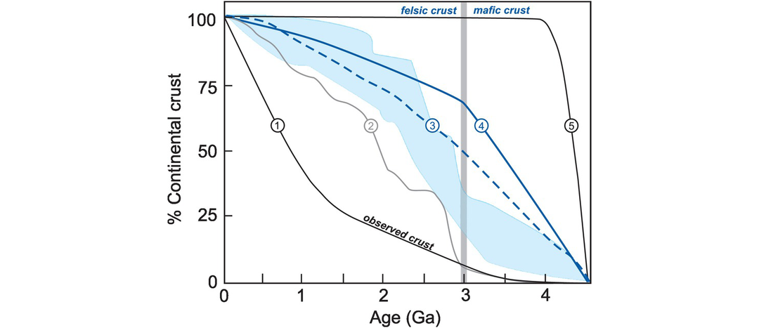 The growth of the continental crust through time. Curve 1 shows the volume of observable continental crust today (Goodwin, 1996). Curves 2–4 represent inferred crustal growth or juvenile crustal production over time (2, Condie and Aster, 2010; 3, Belousova et al., 2010; 4, Dhuime et al., 2010). Curve 5 is Armstrong’s (1981) steady-state model. The shaded region represents other crustal growth curves from Viezer and Jansen (1979), McLennan and Taylor (1982), Patchet and Arndt (1986), Chase and Patchett (1988) and McCulloch and Bennett (1994). Note the change in the rate of crust production after about 3 Ga, indicated by the vertical bar, for most models in the shaded region and models 2 and 4.