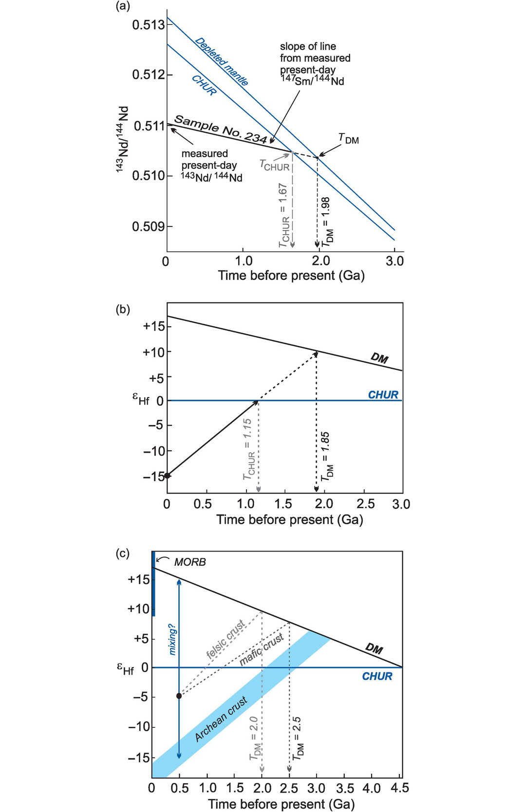 The calculation of Nd and Hf model ages. (a) The evolution of 143Nd/144Nd over time for sample 234 (Table 6.4) compared with two models of the mantle: CHUR (the chondritic uniform reservoir) and DM (the depleted mantle). A Nd model age is the time at which the sample had the same 143Nd/144Nd ratio as its mantle source. In this case there are two possible solutions depending upon the preferred mantle model. The TCHUR model age is approximately 1.67 Ga and the TDM model age is approximately 1.98 Ga. A similar diagram can be constructed using the epsilon notation (Section 6.3.4) in place of 143Nd/144Nd. (b) The evolution of 176Hf/177Hf expressed in εHf units (see Section 6.3.4) versus time. The Hf model age is the time at which the sample had the same 176Hf/177Hf ratio as its depleted mantle source. In this example the whole-rock 176Hf/177Hf measured today (εHf = −15) is extrapolated back through time until it intersects the model mantle composition of interest, providing the model age (THfCHUR = 1.15 Ga; THfDM = 1.85 Ga). (c) The evolution of εHf versus time and Hf-in-zircon model ages (modified from Kemp and Hawkesworth, 2014; with permission from Elsevier). Three different scenarios are shown for a zircon crystallised from a melt at 500 Ma with an εHf = −5. (i) The zircon crystallised from a melt that was derived from older mafic crust producing THfDM = 2.5 Ga; (ii) the melt was derived from an older felsic continental crust producing THfDM = 2.0 Ga; (iii) the melt was derived from a mixture of juvenile mantle melt and melt extracted from a heterogeneous Archean crust (dashed arrow) – in this case the model age has no significance. Also note the variation in depleted mantle composition as recorded by MORB (εHf = +8 to +22) compared with the assumed DM model composition. In the absence of other constraints, all scenarios can generate significantly different model ages.