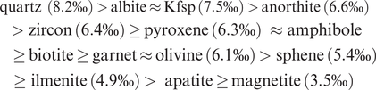 Isotopic fractionations between minerals and melt vary as a result of the changing composition of the melt. Mineral–melt fractionations are defined in the same way as for mineral pairs (Eq. 7.2) and these values are particularly useful when seeking to calculate the stable isotope composition of a melt from the isotopic composition of one or more refractory or phenocryst phases. Other approaches used to measure the isotopic composition of a melt include the direct measurement of the fresh glass, or to treat the melt as a mixture of normative minerals with a fractionation factor calculated from the weighted average of the fractionation factors of the normative minerals (Bindeman, 2008).