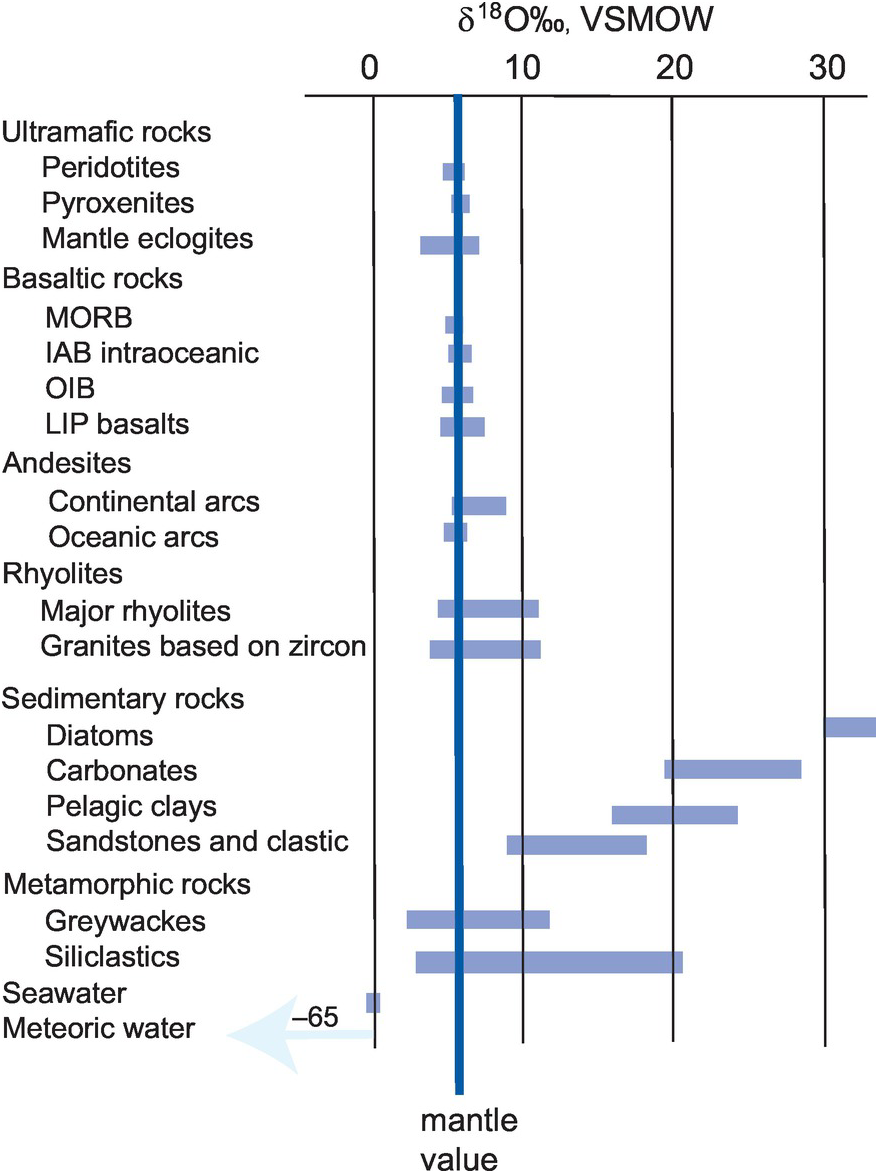 δ18O values vary in nature by about 100‰ with about half of this range occurring in meteoric water (Figure 7.1). Evidence from the analysis of ocean basalts indicates that the mantle δ18O value is 5.7 ± 0.2‰ (Bindeman, 2008), similar to the value for lunar basalts and constant over geological time (Taylor, 1980). The bulk δ18O value of chondritic meteorites is similar or slightly lighter than that of the Earth’s mantle. Felsic magmas show a broader and more positive range of δ18O values than is found in mafic and ultramafic rocks, and, similarly, sedimentary rocks and meta-sediments are isotopically heavier than mafic rocks and the mantle. Natural waters have very variable oxygen isotope compositions, as discussed below in Section 7.3.2.3, and some water types have strongly negative values relative to the VSMOW standard.