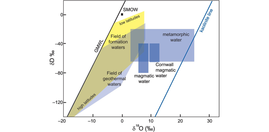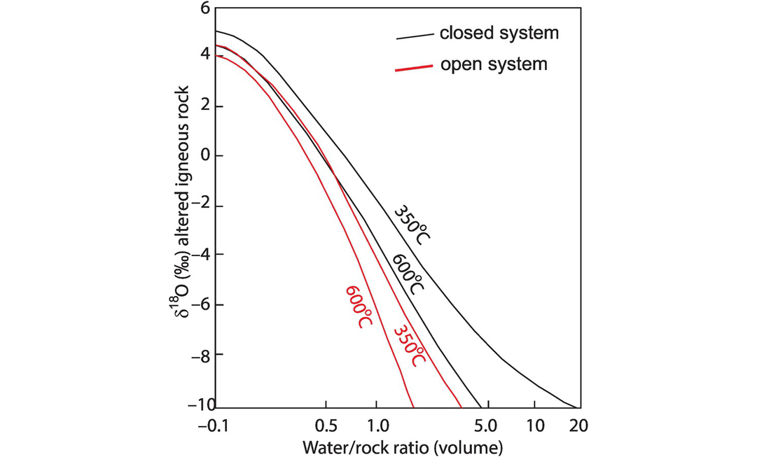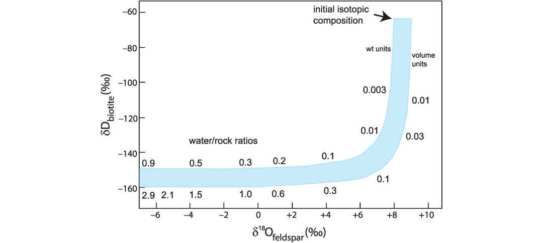 The study of oxygen isotopes in conjunction with the isotopic study of hydrogen has proved to be a very powerful tool in investigating geological processes involving water. When plotted on a bivariate δD versus δ18O graph, waters from different geological environments are found to have very different isotopic signatures (Section 7.3.2.3). Hydrogen is a minor component of most rocks, and so, excepting when the fluid–rock ratio is very low, the hydrogen isotope composition of rocks and minerals is sensitive to the hydrogen isotope composition of interacting fluids. Oxygen, on the other hand, comprises 50‰ by weight (and in some cases more than 90‰ by volume) of common rocks and minerals and so is less sensitive to the oxygen isotope ratio of interacting fluids, except at very high fluid–rock ratios (Section 7.3.2.6).