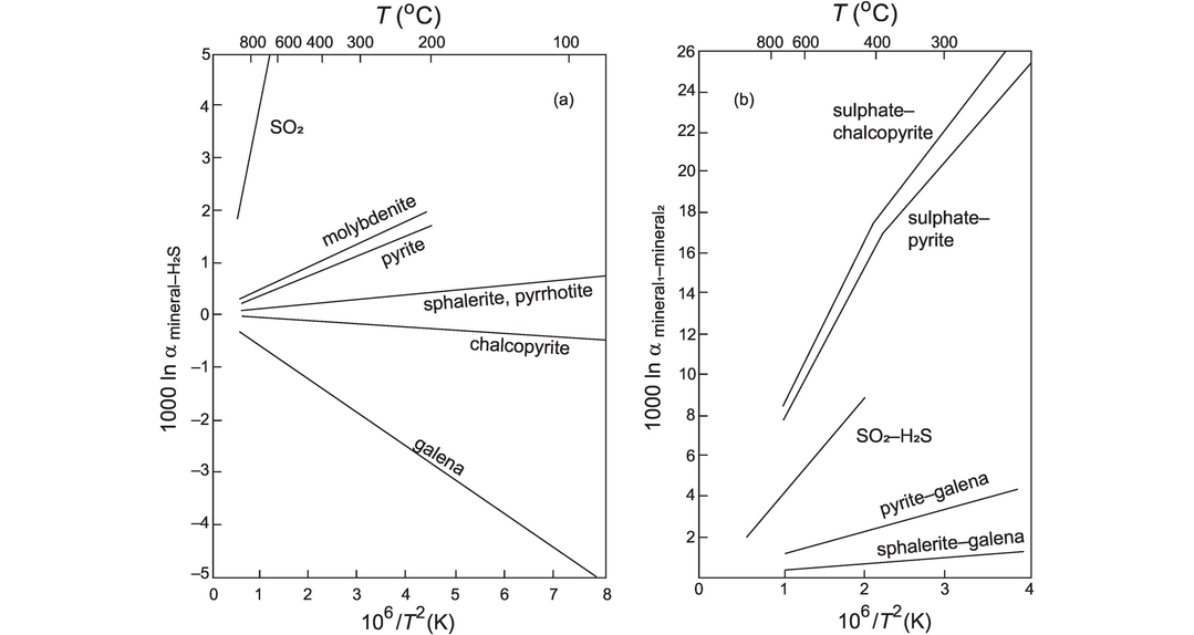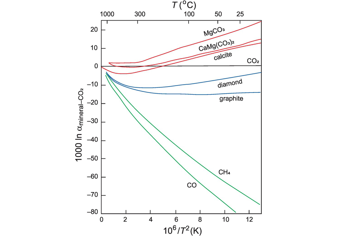 (b) Low-temperature applications of oxygen isotope thermometry. The earliest application of oxygen isotopes to geological thermometry was in the determination of ocean palaeotemperatures. The method assumes isotopic equilibrium between the carbonate shells of marine organisms and ocean water and uses the equation of Epstein et al. (1953). This equation is still applicable despite some proposed revisions (Friedman and O’Neill, 1977):