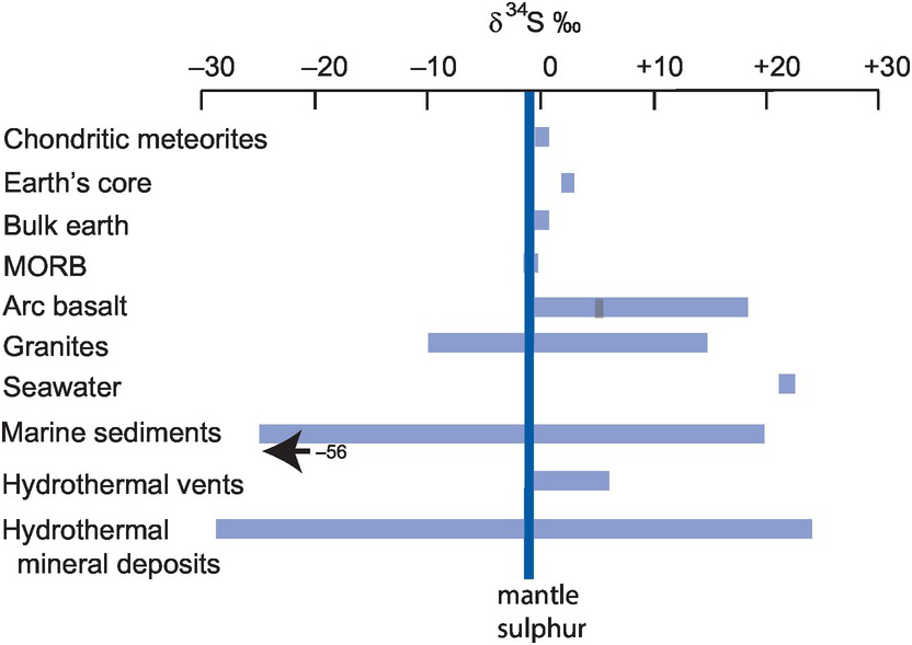 Kinetically controlled stable isotope fractionation is particularly important during biological processes and so is relevant to all the traditional stable isotope systems. Products from bacterial reactions tend to be enriched in in the light isotope because the dissociation energies are lower and bonds more easily broken. For example, the bacterial reduction of seawater sulphate to sulphide proceeds 2.2‰ faster for the light isotope 32S than for 34S. For the reactions