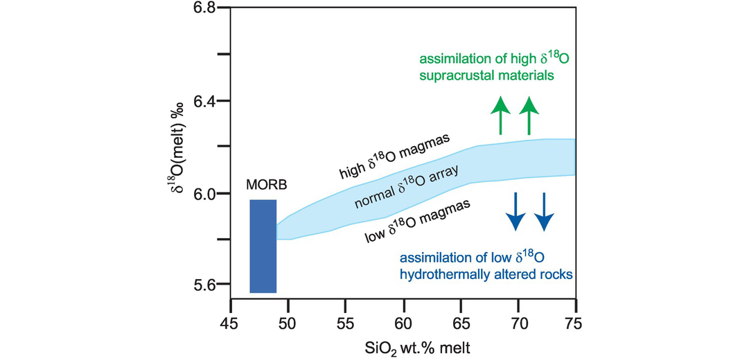A δ18O versus SiO2 plot showing the field of mid-ocean ridge basalts (MORB) and the normal array of intermediate to felsic magmas. Also shown are the manner in which high-δ18O melts are produced by the assimilation of high-δ18O supracrustal materials and low-δ18O melts are the product of the assimilation of low-δ18O hydrothermally altered rocks.