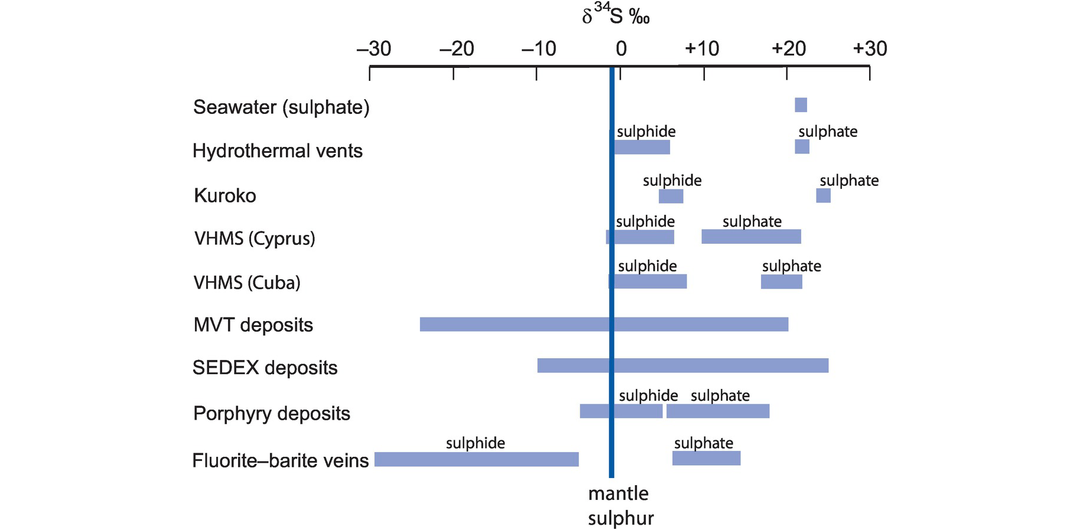 In biogeochemical processes the principal controls on iron isotope fractionation include bacterial dissimilatory iron reduction (DIR) and iron oxidation. During DIR, bacteria use Fe3+ as an electron acceptor in anaerobic respiration – an important process in the formation of sulphide minerals. Experimental studies show that iron isotope fractionation between Fe2+ in solution and a ferric substrate during DIR can lead to δ56Fe values that are up to 2.95‰ lower than that of the substrate, very similar to the values determined by Welch et al. (2003) for the abiotic fractionation of aqueous Fe2+–Fe3+. In contrast, photosynthetic Fe2+-oxidising bacteria, operating under anaerobic conditions and using Fe2+aq as an electron donor, crystallize hydrous ferric oxide enriched in δ56Fe by about 1.5‰. Plants also fractionate iron isotopes relative to soil, with an overall range in fractionation of up to 4.5‰ (see review by Dauphas et al., 2017).