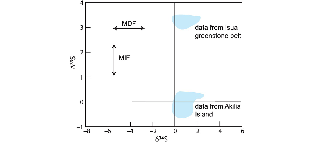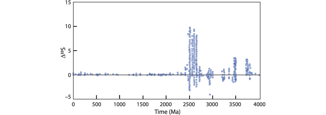 Current thinking attributes the mass-independent fractionation of sulphur isotopes to photochemical reactions in the upper atmosphere (Ono, 2017); see Section 7.3.4.4. The changing pattern of mass-independent sulphur isotope evolution over time is therefore thought to relate to the chemical evolution of the Earth’s atmosphere. Experimental studies show that photolysis reactions in the ultraviolet range are capable of producing large mass-independent fractionations. This observation suggests that Earth’s ozone layer, which protects the planet from damaging ultraviolet radiation, was not present in the early Earth, supporting the view that the Earth’s early atmosphere was not oxygenic.