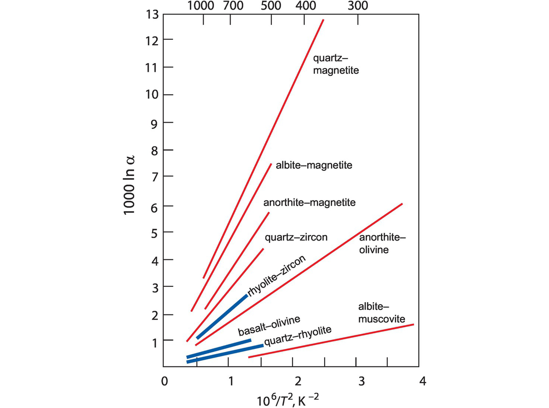 Empirical observations indicate that a graph of ln α versus 1/T2 is linear over a temperature range of several hundred degrees (Figure 7.3) and a plot of this type for a pair of anhydrous phases should pass through the origin. Isotopic fractionations decrease with increasing temperature, and so oxygen isotope thermometers might be expected to be less sensitive at high temperatures. However, experimental studies are most precise at high temperatures (see, e.g., Clayton et al., 1989), and so thermometers have been calibrated for use with igneous and metamorphic rocks. Temperature estimates are most reliable for mineral pairs with large 1000 ln α values, such as the mineral pair quartz–magnetite (Figure 7.3).