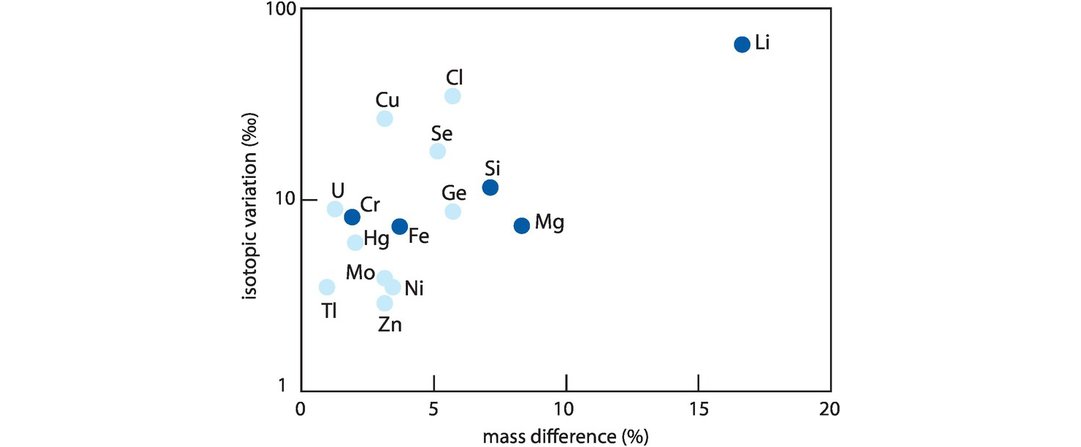 With the advent of multi-collector ICP-MS technology, a number of elements with higher atomic numbers, whose stable isotope variations had been regarded previously as too low to measure accurately, have been shown to have natural isotopic variations and added to the geochemical toolbox. These are often termed the non-traditional stable isotopes. Many occur as trace elements, some are redox sensitive, and some are biologically active, and because of their metallic nature some represent different bonding environments from the traditional covalently bonded stable isotopes. There are a large number of elements crowding into this field, with others emerging. Here we consider five of the non-traditional stable isotopes – the light elements Li, Mg and Si and the heavier elements Cr and Fe – to illustrate their diverse applications in modern geochemistry.