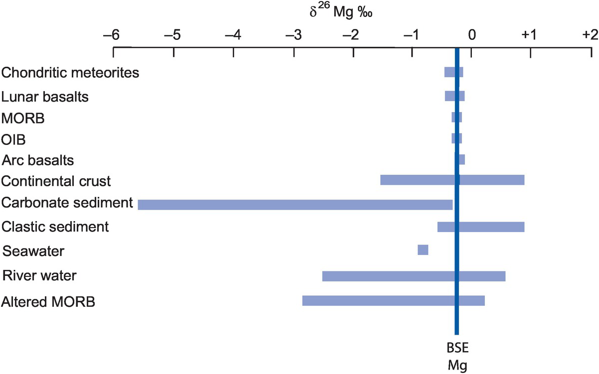 Magnesium is found in silicate rocks and the oceans and is an essential element in the biosphere. It is present as a major component in ferromagnesian minerals, carbonates, sulphates and clay minerals in igneous, metamorphic and sedimentary rocks. There are three isotopes of magnesium – 24Mg, 25Mg and 26Mg – and isotope ratios are measured as 26Mg/24Mg, expressed as δ26Mg‰ (Eq. 7.26) relative to a synthetic standard (Box 7.10). The range of fractionation found in most terrestrial materials is between ~−6 and +2‰ (Figure 7.32); this range is small compared with other stable isotope systems (Figure 7.30).