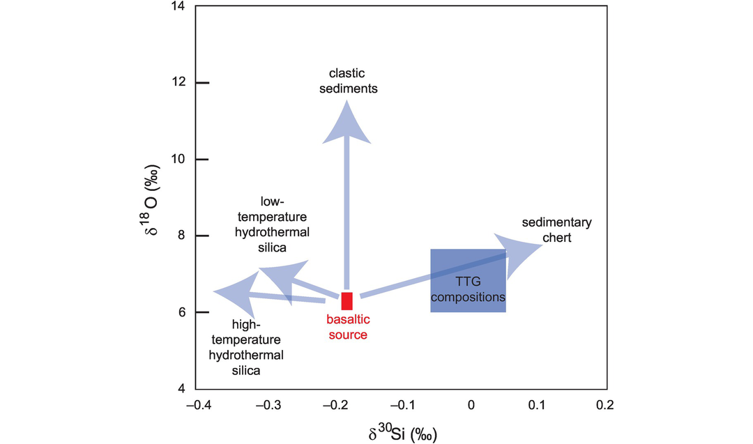 High-resolution silicon versus oxygen isotope diagram showing the likely origin of heavy δ30Si enrichment in Archaean tonalite–trondhemite–granodiorite (TTG) magmas. The diagram shows the influence of different contaminants on the silicon and oxygen isotope composition of a partial melt of a basaltic source (red box) relative to the measured composition of Archaean TTGs.