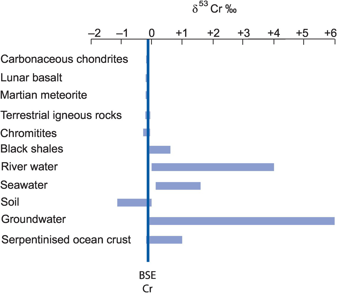 Chromium isotopes have been used to study processes in the early solar system, in the redox evolution of the Earth’s early atmosphere and oceans and in environmental geochemistry to investigate contaminated groundwater.