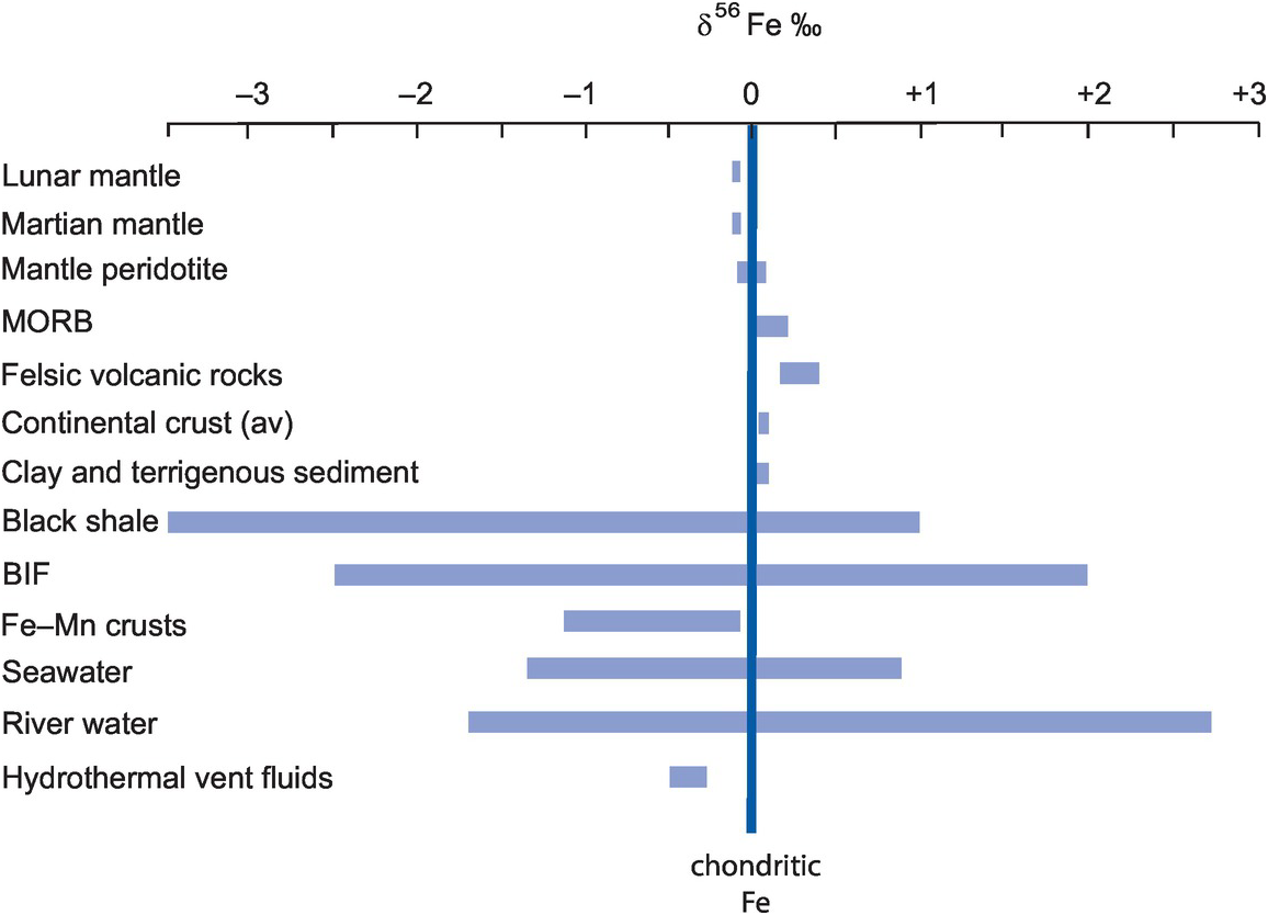 The largest fractionations between the isotopes of iron are to be found in aqueous environments and as a result of biogeochemical processes (Figure 7.36). The balance of iron isotopes in the oceans is controlled by the input of isotopically heavy Fe in aerosol dust and river water, the input of isotopically light hydrothermal vent fluids and pore waters and the biological removal of heavy isotopes (Albarede et al., 2017; Dauphas et al., 2017).