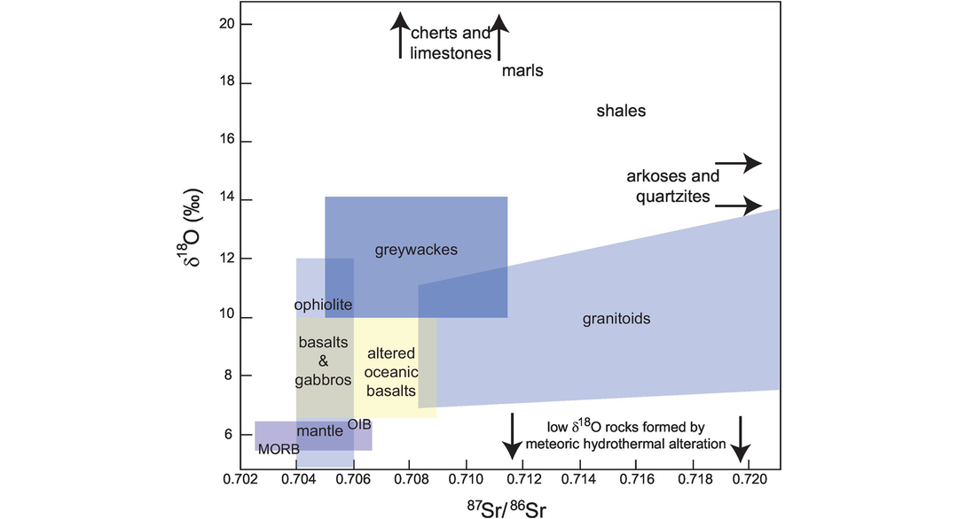 The indicative ranges of oxygen and strontium isotopes in common igneous and sedimentary rocks.
