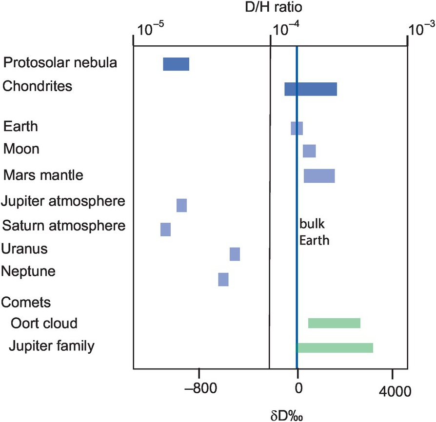 Silicon isotope measurements in chondritic meteorites are in the range δ30Si = −0.41 to −0.64‰. δ30Si values for carbonaceous chondrites (−0.41 to −0.45‰) and ordinary chondrites (−0.46 to −0.49‰) are within error of each other and together have a mean value of −0.46 ± 0.02‰. Enstatite chondrites are isotopically lighter and have δ30Si values between −0.59 and −0.64‰. In contrast to the narrow range of values within chondritic meteorites, rare pre-solar SiC grains found included in chondrites show extensive fractionation with a range of 2000‰, which is thought to reflect nucleosynthetic processes in the universe prior to the formation of the Sun. Basaltic samples from the Moon yield a bulk silicate moon δ30Si value of −0.27 ± 0.02‰ and Martian meteorites of igneous origin have δ30Si = −0.56 to −0.33‰, with a bulk silicate Mars value of −0.49 ± 0.03‰, similar to the chondritic value (Zambardi et al., 2013).