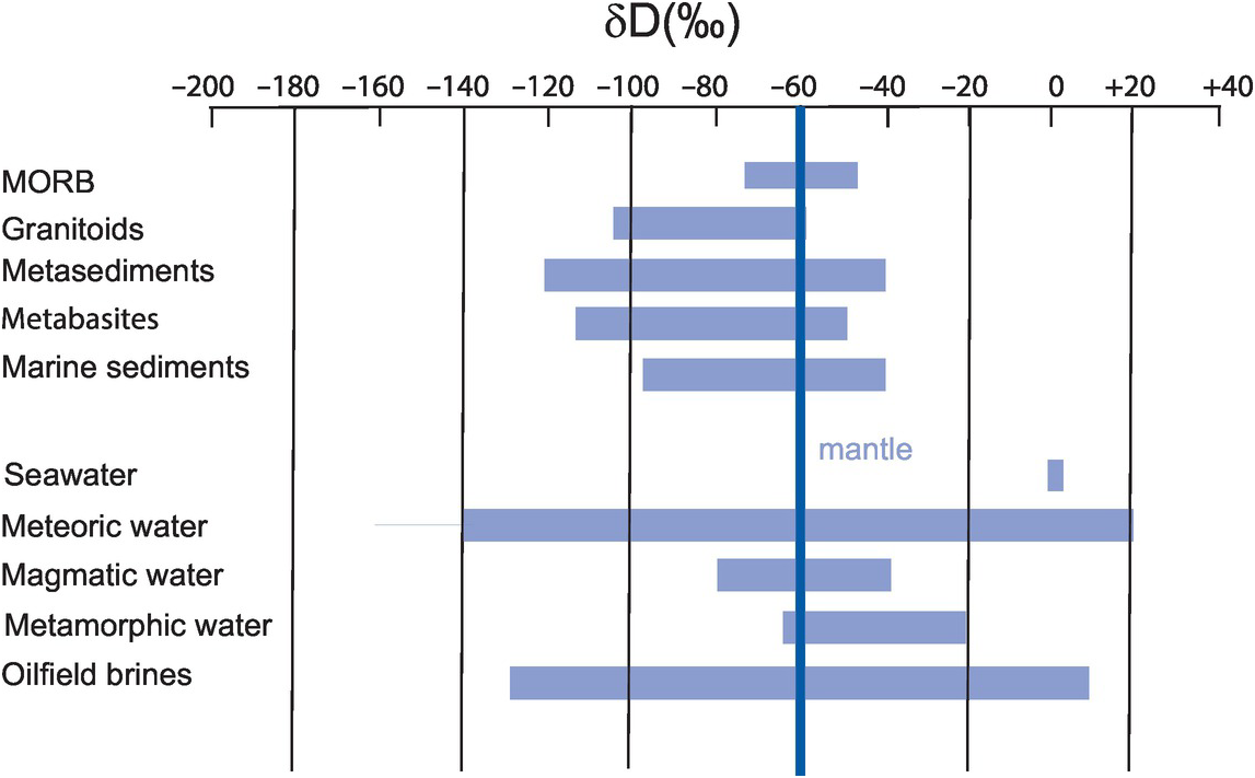 The element hydrogen is ubiquitous in nature in the forms H2O, OH−, H2 and as hydrocarbons. There are two isotopes of hydrogen: 1H and 2H, normally referred to as D (deuterium); isotope ratios are measured as the ratio D/1H, expressed as δD. Hydrogen isotopes show the largest relative mass difference between two stable isotopes with the result that there are large variations in measured hydrogen isotope ratios in naturally occurring materials.